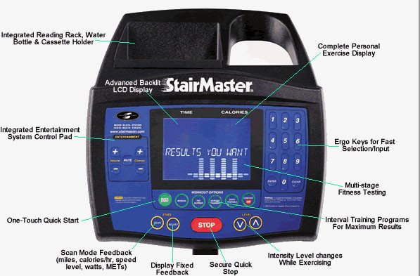 The Stairmaster 4400PT Stepper features an upright, rail-less design which encourages an improved exercise posture for the best lower-body workout of any stair climbing machine. This Stairmaster is the most space-efficient Stairclimber on the market (it fits in less than 2' x 4'/61 x 122 cm of floor space), and yet is extremely effective for a wide range of climbing exercise and conditioning needs. Patented, independent pedal geometry ensures safe, biomechanically-correct movement.